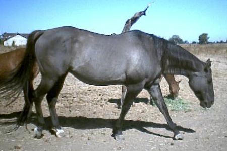 This 1989 Grullo Mare is a daughter of the grullo AQHA stallion Miracle Moon, ROM Race with SI 102, and a sire of AQHA ROM Race, top roping winners, and ABRA World Champions. She is out of the Black AQHA mare Barbaretta Go (ROM Race SI88).