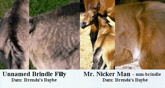 Brenda's Baybe had three foals before she had to be put down due to an accident from trailer loading. Pictures were not taken of her first foal. Her second foal was a 2 week premature filly pictured below on the left. A definite brindle, she had coat texturing and two colors (buff and gray) apparent in her coat at birth. Had she lived, the gray areas would have become brown or black, and the buff areas would probably have been a lighter shade of brown.
