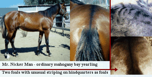 Thus, I found that coat texturing in a foal is no guarantee that they are carriers of the brindle pattern. In fact, I know of numerous other foals (from non-brindle breeding) that have also exhibited coat texturing as foals. Both the foals shown above on the right had odd texturing and striping patterns on the hindquarters which they lost as they matured. In general, the young of many species often exhibit primitive patterns which they loose. Examples would be lion cubs, tapirs, and deer. Both lion cubs and baby tapirs have stripes in their coats which they loose as they mature. Fawns have white spotting in their coats which they loose as adults.