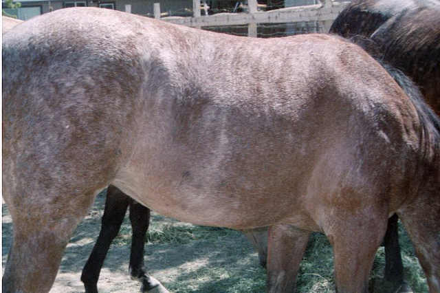 Brenda's Millennium is an own daughter of Brenda Batty Atty (foundation mare for one family line of Brindles). Foals from Brenda's line are born with the pattern and exhibit the pattern year-round. Note the "moth-eaten" appearance caused by raised tufts of hair, indicating different hair lengths characteristic of the pattern in this family group.