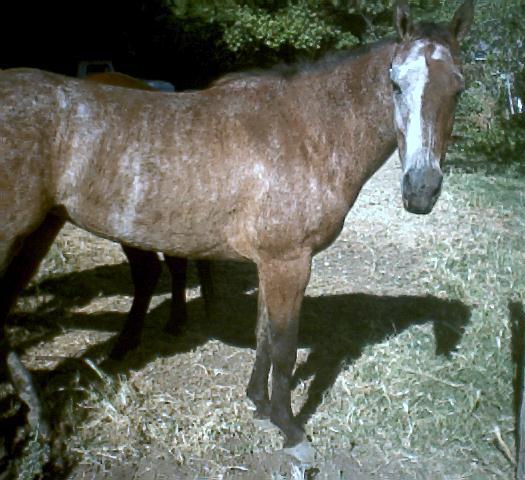 2000 Red Bay and White Brindle filly out of the Brindle mare Brenda Batty Atty by the mahogany bay AQHA stallion Ima Star Brindle Bar, who is a carrier of the seasonal brindle pattern from his dam Im A Star Moon Bar. Ima Star Brindle Bar has reproduced the seasonal brindle pattern in his offspring even though he shows no visible striping himself. (For examples of crosses on non-brindle mares refer to the foals Shadow's One and Brindle Batty Atty).