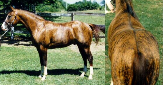 Dunbar's Gold is by a red dun sire, Two D Nine, who won a halter futurity in 1974 at an Illinois/Indiana Buckskin Futurity. Two D Nine's dam, Miss Two Larue, has 13 AQHA points in halter, and 9 working points. Dunbar's Gold is out of a red dun Quarter Horse mare named Outa Chigger. She has had four foals since the Dunbar's got her; two duns, one sorrel, and the brindle colt featured this month. As you can see from their photographs, neither parent showed any obvious signs of striping, other than the usual dun factor markings associated with the dun dilution. An analysis of their pedigrees shows no "up close" common ancestors with any other brindles that we know of. There have been some remote common ancestors, but we don't know if this is any significance as of yet. Remote ancestors include Silver King, Tom Adair, Poco Bueno breeding, and Waggoner breeding. Below are pictures of the sire and dam.