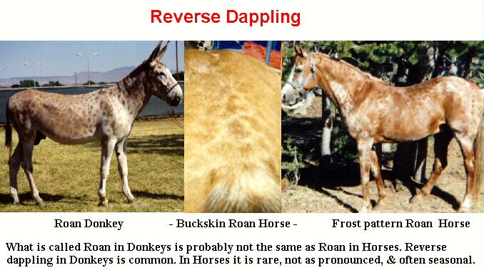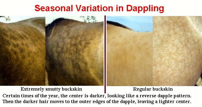 Also of interest is the seasonal variation of dappling. Below are pictures of two horses, taken at different times of the year. Refer to the pictures for each horse on the left side. In both horses, the dappling started as a darker spot (looking like a reverse dapple pattern). Then the darker hair migrated to the edges producing the classic lighter centered dapple. Similar migrations of pigment have also been reported in Appaloosa horses, although the dapple spots and appaloosa spots themselves probably result from different mechanisms.