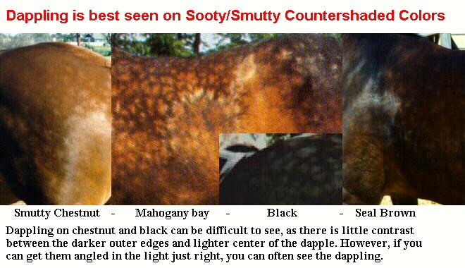 It has also been said dappling indicates a state of good condition or good nutrition. It may well be that good nutrition has an influence in the expression of dappling. However, it doesn't explain why dappling seems to run in some families and not in others, and why dappling shows seasonal and yearly variations in horses that are well fed and in a constant state of good nutrition.