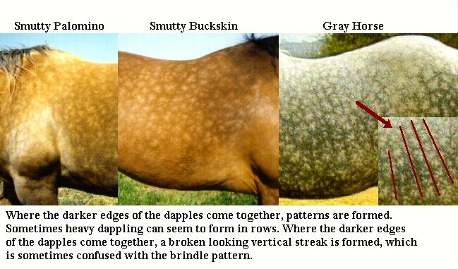 The different hair lengths in dappling is interesting. Other patterns, such as Appaloosa patterns, Paint/Pinto spotting, and brindle striping, also show various forms of coat texturing. While most of my Brindle horses did not show any dappling, I did have one line of brindles from a brindled buckskin mare (Im A Star Moon Bar) that also had dappling. I classified her brindle pattern as "seasonal" brindle because at certain times of the year, generally spring and fall, it was more visible than at other times. She also appeared much more brindled during the time she was lactating after foaling (spring, summer, and fall).