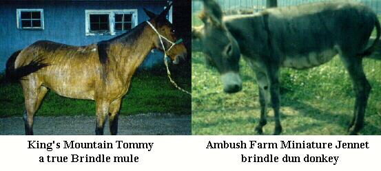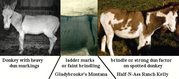 Brindle in the donkey is less defined than on the horse or mule, but body striping is present. Some donkeys appear to have the beginnings of the brindle pattern in the ladder marks seen dripping off the dorsal stripe. Carry this one step further, and you have a donkey with dark lines over the back and ribs. There has even been one registered Spotted Brindle donkey!