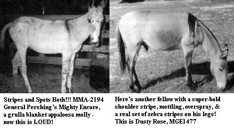 Mules always tend to have a ball with coat coloration and markings. Just as the markings of horse pinto, donkey spotted and horse appaloosa patterns are skewed on the mule, the same is true for the dun factors. Mules may have shoulder stripes that are over 4 inches wide! There may be more than one stripe at the withers, often one bold one and numerous smaller stripes fanning over the shoulder blades. The neck and rump may be darkened as if sprayed over with dark paint. The leg garters (zebra stripes) may be more numerous, wider, and bolder than on either the donkey or horse parent. Surprise mules have come from unmarked solid mares even when the jack does not have flamboyant markings!