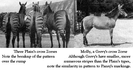 It is interesting to note that the zebra hybrid does not necessarily keep the main pattern of striping of the zebra parent. Most hybrids, regardless of the cross of parent (grants, zorse, Grevy's, zebrass) have a striping pattern that is less distinct, but with more numerous stripes, than the zebra parent breed. Zebra striping patterns, although individual to each animal, do have noted specific guidelines" in the number of stripes that appear on the neck and body in each sub-species. Most zebra hybrid patterns break up over the loins and rump, resembling the brindle pattern to a degree.